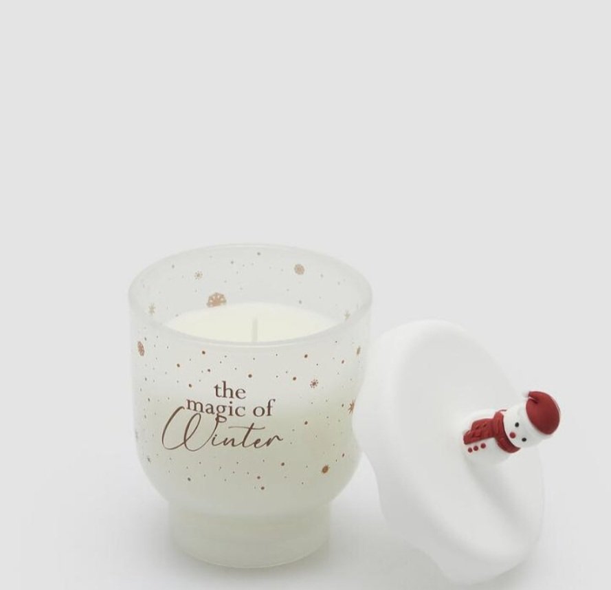 Candela profumata con simpatico coperchio in silicone e pupazzo di neve.