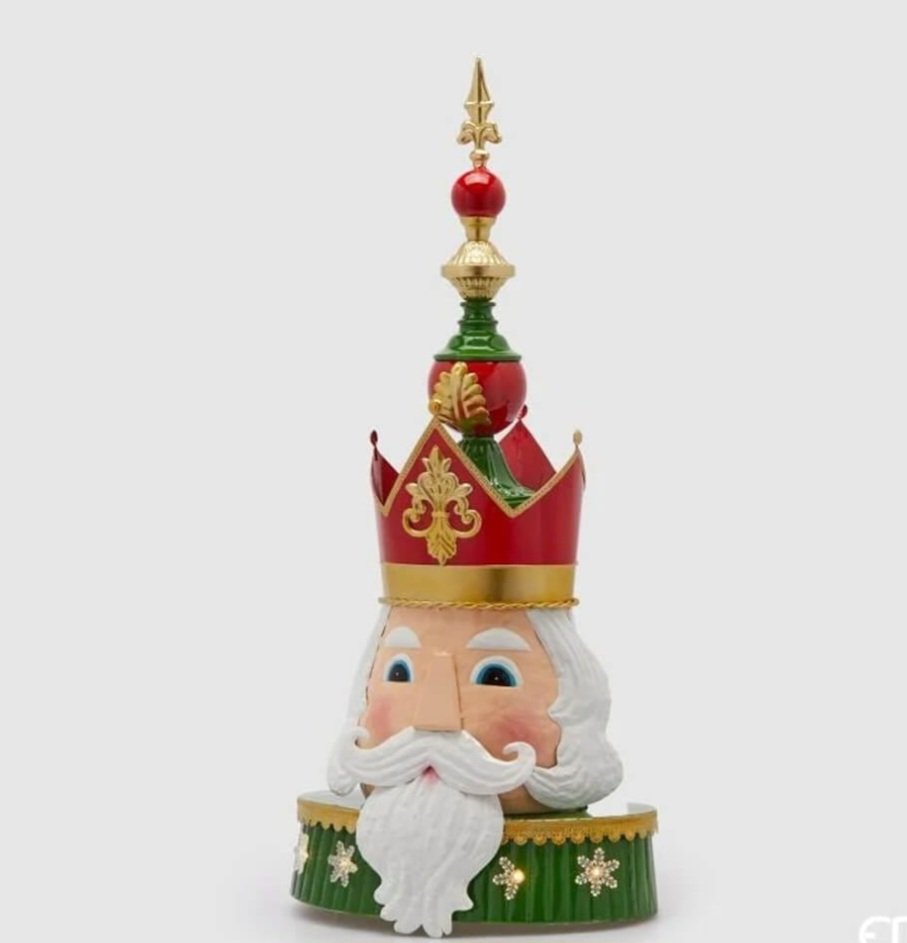 Decorazione natalizia luminosa a forma di testa di soldatino con corona dorata e dettagli glitterati. Effetto lucido e inserti a fiocco di neve.