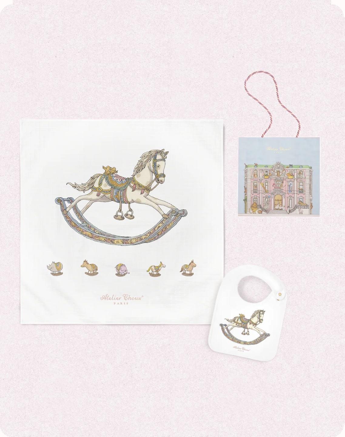 Il Set Carré & Bavaglino – Rocking Horse di Atelier Choux è un raffinato cofanetto regalo che include il nostro iconico Carré e un bavaglino satinato coordinato. Questo duo unisce eleganza sofisticata e praticità quotidiana, rendendolo il regalo perfetto per i neonati e per i genitori più attenti allo stile.